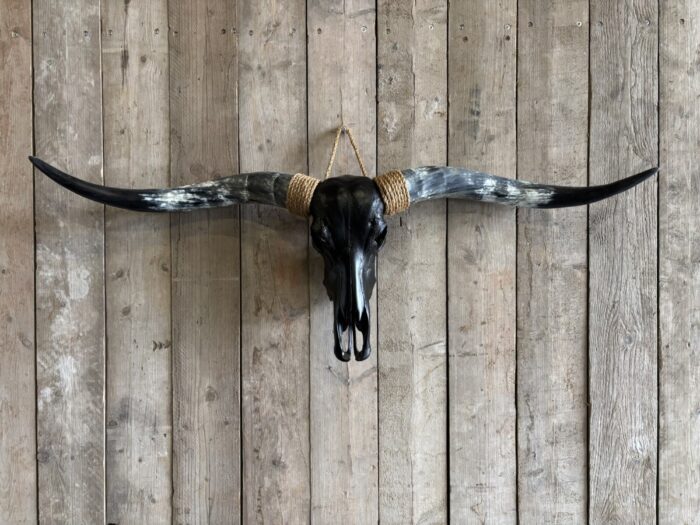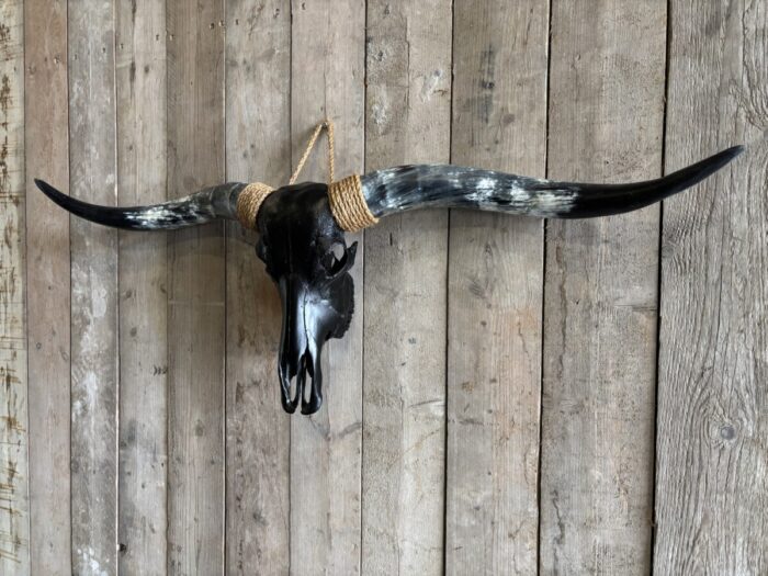 Mooie stoere zwarte Longhorn schedel met geschuurde hoorns.