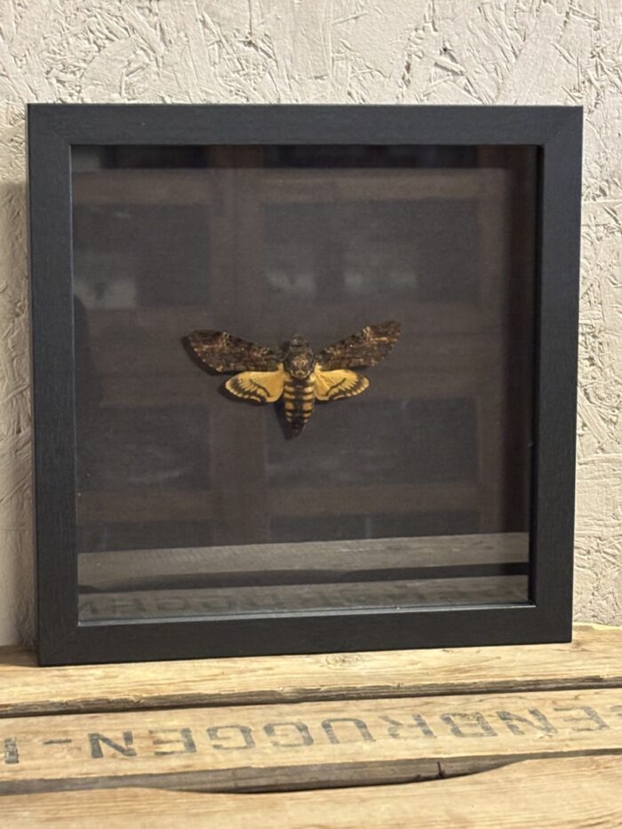 Mooie opgezette doodshoofd mot in zwarte lijst met zwarte achtergrond.