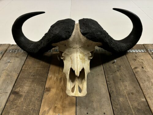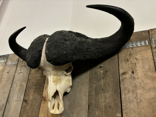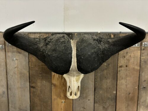 Deze imposante Kafferbuffel schedel is een echte blikvanger aan uw wand, met deze prachtige schedel maakt u in elke kamer in uw huis een statement. De afmeting van deze schedel is 103cm breed/62cm hoog/31cm diep. Door de witte schedel met zwarte hoorns past deze schedel vrijwel in elke interieur.