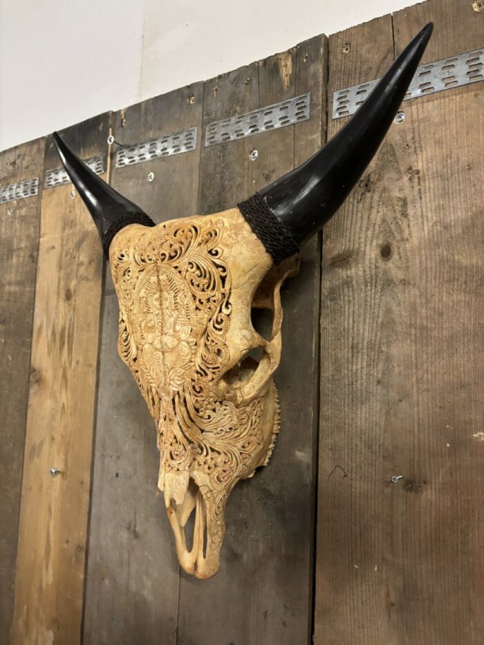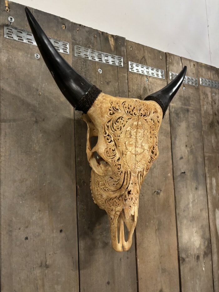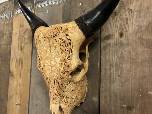 Deze mooie hand gegraveerde koe schedel is een prachtige eyecatcher aan uw wand. Door de prachtige gravering in zowel schedel als hoorns past deze schedel perfect in elk interieur. Deze schedel is 52cm breed en 58cm hoog.