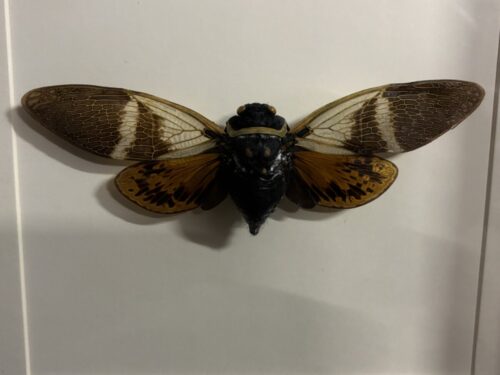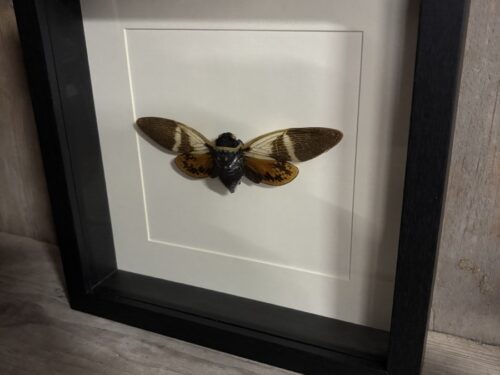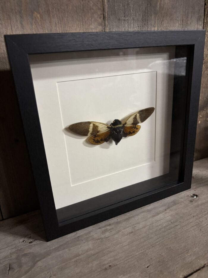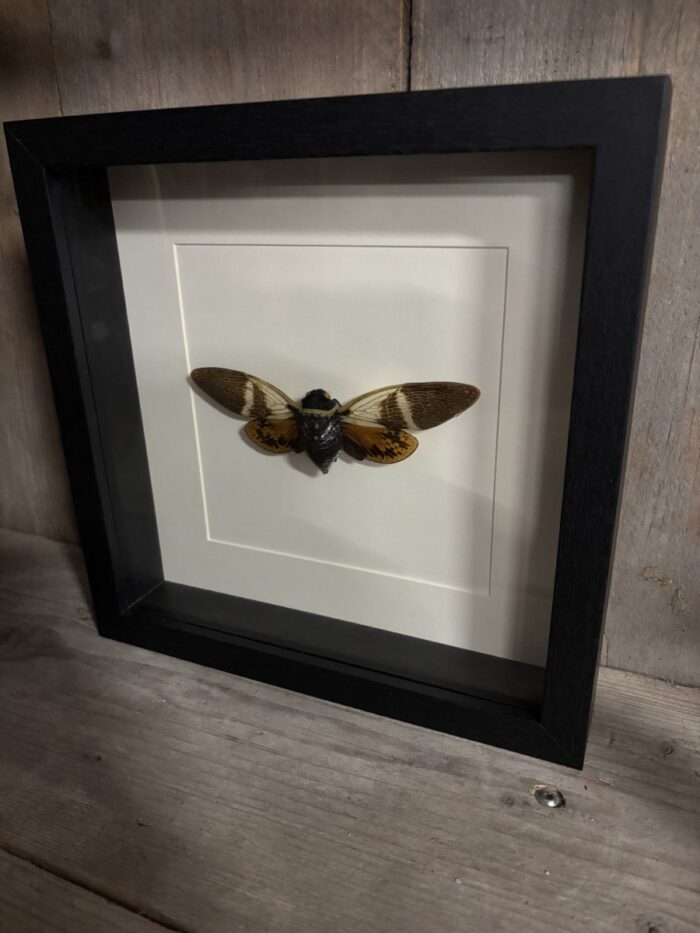 Mooie Kokoscicade in zwarte lijst met witte achtergrond, de lijst is zowel op te hangen als neer te zetten.