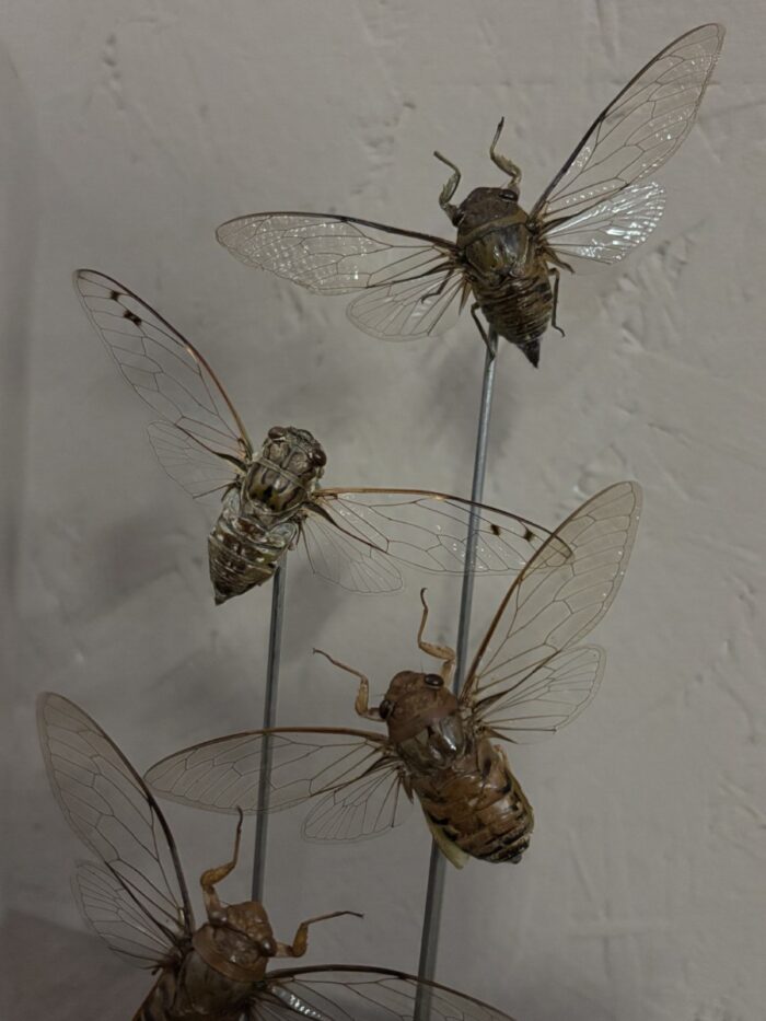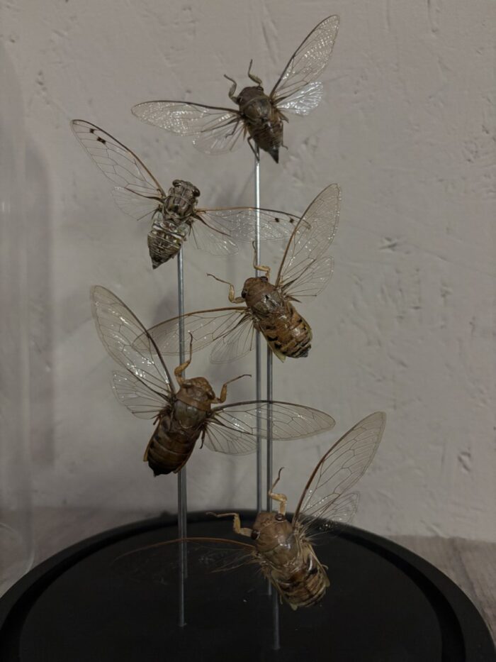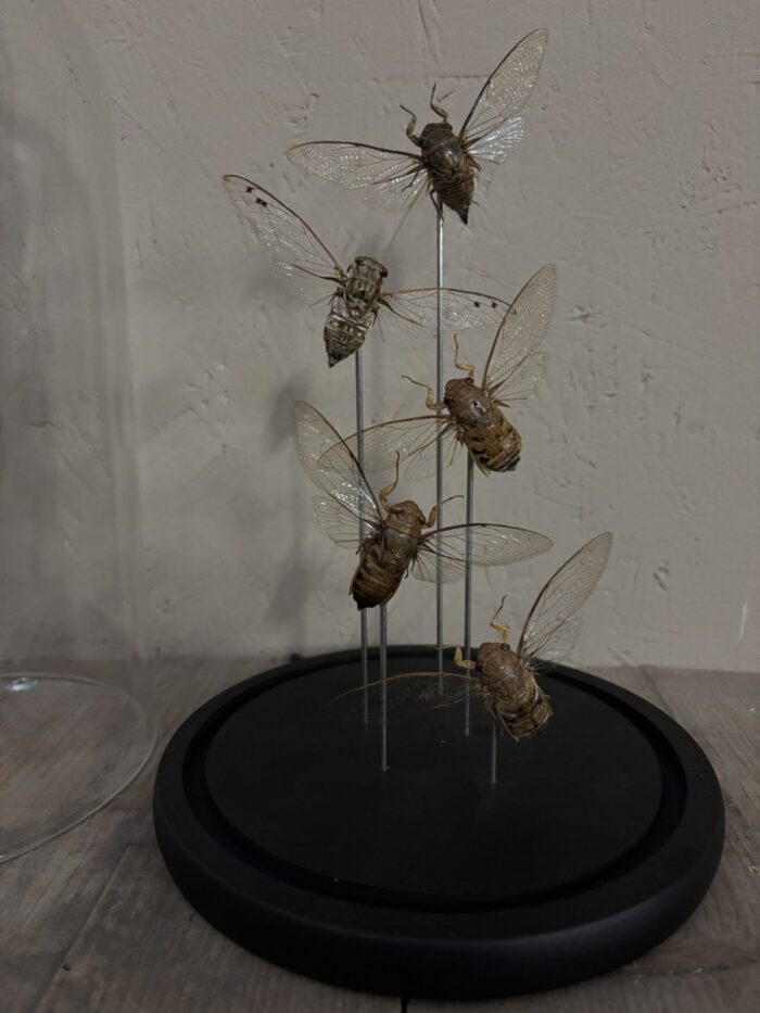 Mooie stolp met vijf stuks opgezette Clearwing Cicaden.