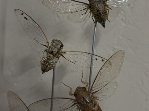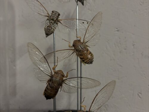 De afmeting van de stolp met opgezette Clearwing Cicaden is 30 cm hoog met een doorsnede van 18 cm.