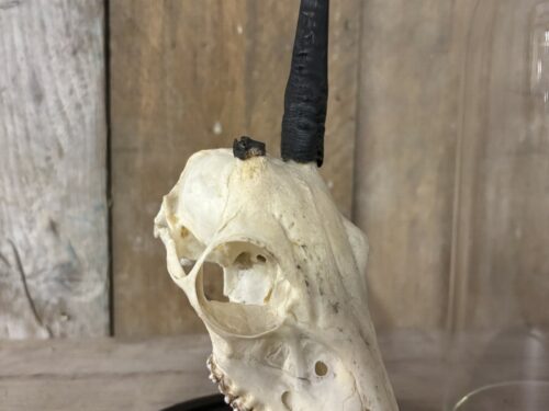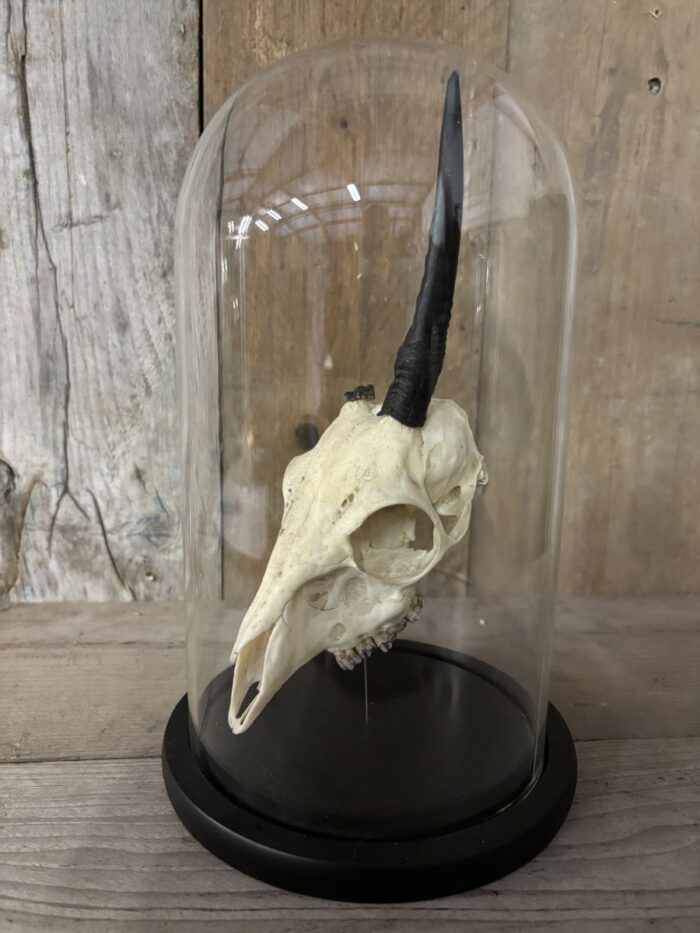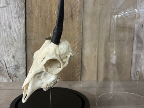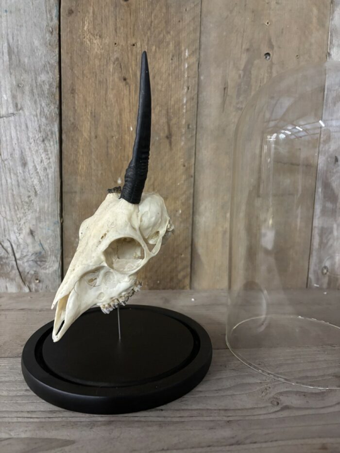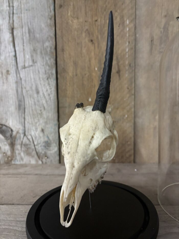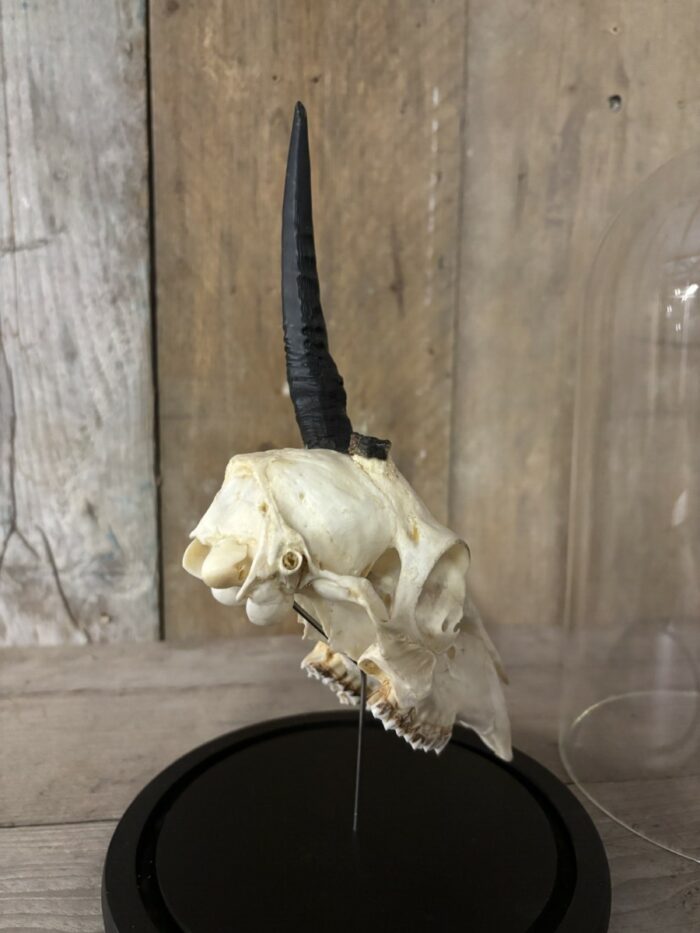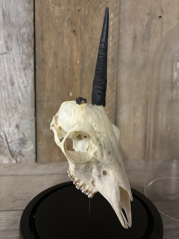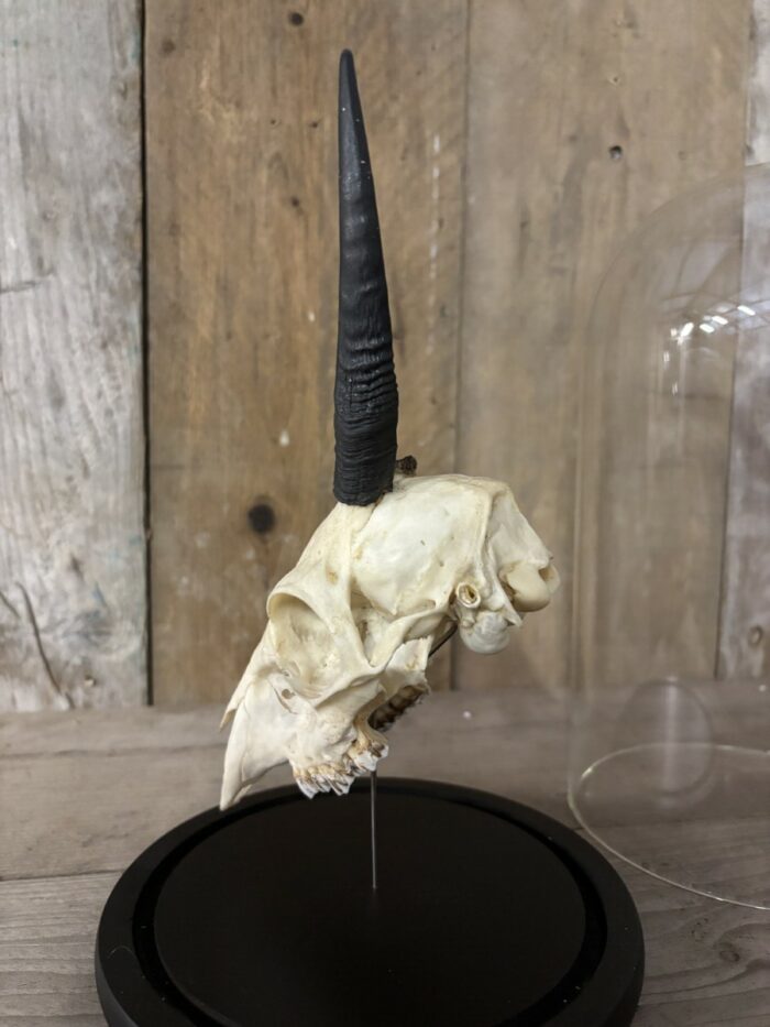 Deze mooie stolp met schedel van een Duiker met 1 hoorn (unicorn) is uniek in zijn soort.