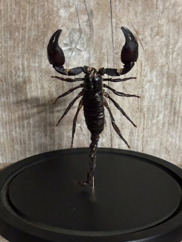 Deze prachtige stolp met opgezette schorpioen is een elegant kunstobject dat de verfijnde schoonheid van de natuur in huis haalt. Het stolpje heeft een hoogte van 22 cm en een doorsnede van 20 cm, perfect voor het tentoonstellen van de opgezette schorpioen in al zijn fragiele pracht. De opgezette schorpioen, zorgvuldig geconserveerd en met oog voor detail gepresenteerd, vormt een opvallende blikvanger in iedere ruimte. Het glazen stolpje biedt optimale bescherming, zodat de opgezette schorpioen zijn tijdloze schoonheid behoudt. Dit decoratieve stuk is niet alleen een indrukwekkend verzamelobject, maar ook een verfijnde manier om de wonderschone details van de opgezette schorpioen te koesteren.