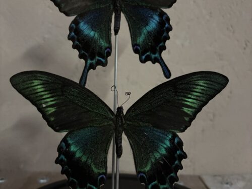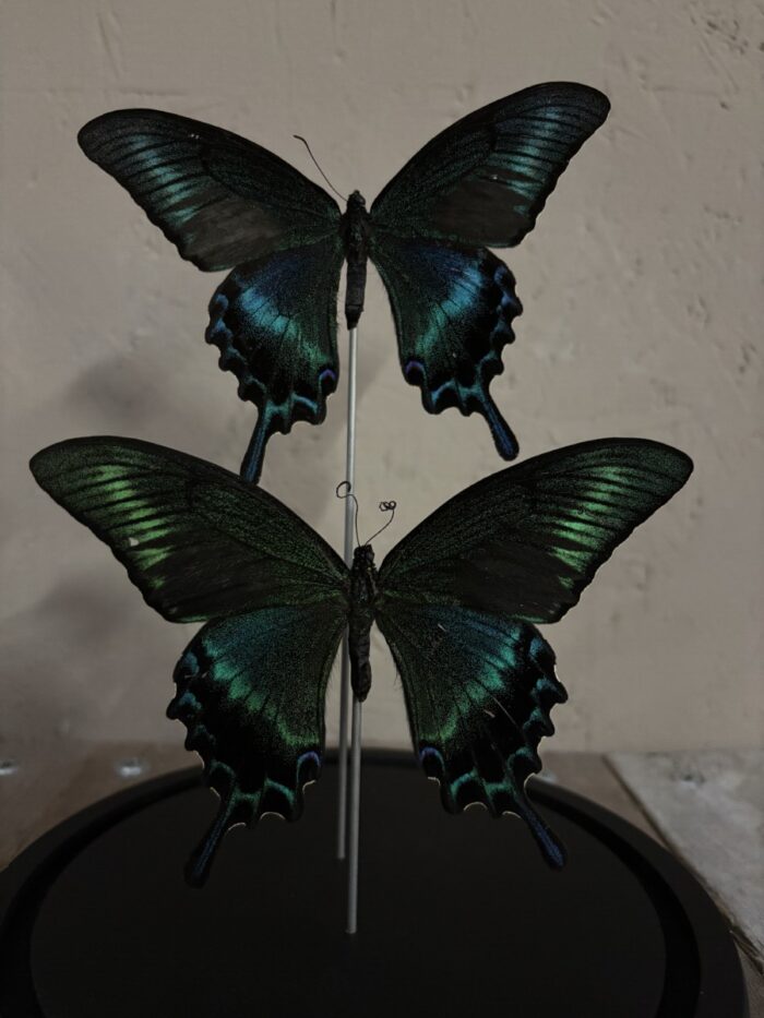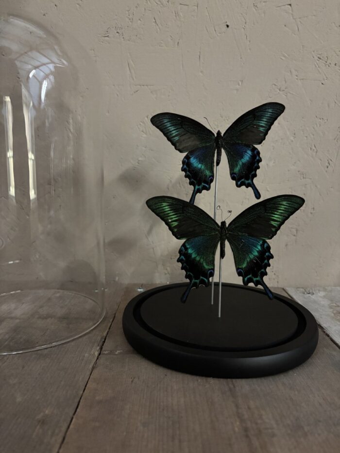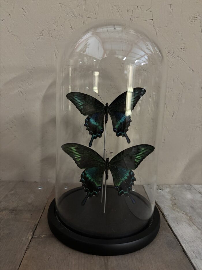 Deze prachtige stolp met opgezette vlinders is een elegant kunstobject dat de verfijnde schoonheid van de natuur in huis haalt. De stolp heeft een hoogte van 30 cm en een doorsnede van 18 cm, perfect voor het tentoonstellen van de opgezette vlinders in al hun fragiele pracht. De opgezette vlinders, zorgvuldig geconserveerd en met oog voor detail gepresenteerd, vormt een opvallende blikvanger in iedere ruimte. De glazen stolp biedt optimale bescherming, zodat de opgezette vlinders hun tijdloze schoonheid behouden. Dit decoratieve stuk is niet alleen een indrukwekkend verzamelobject, maar ook een verfijnde manier om de wonderschone details van de opgezette vlinders te koesteren.