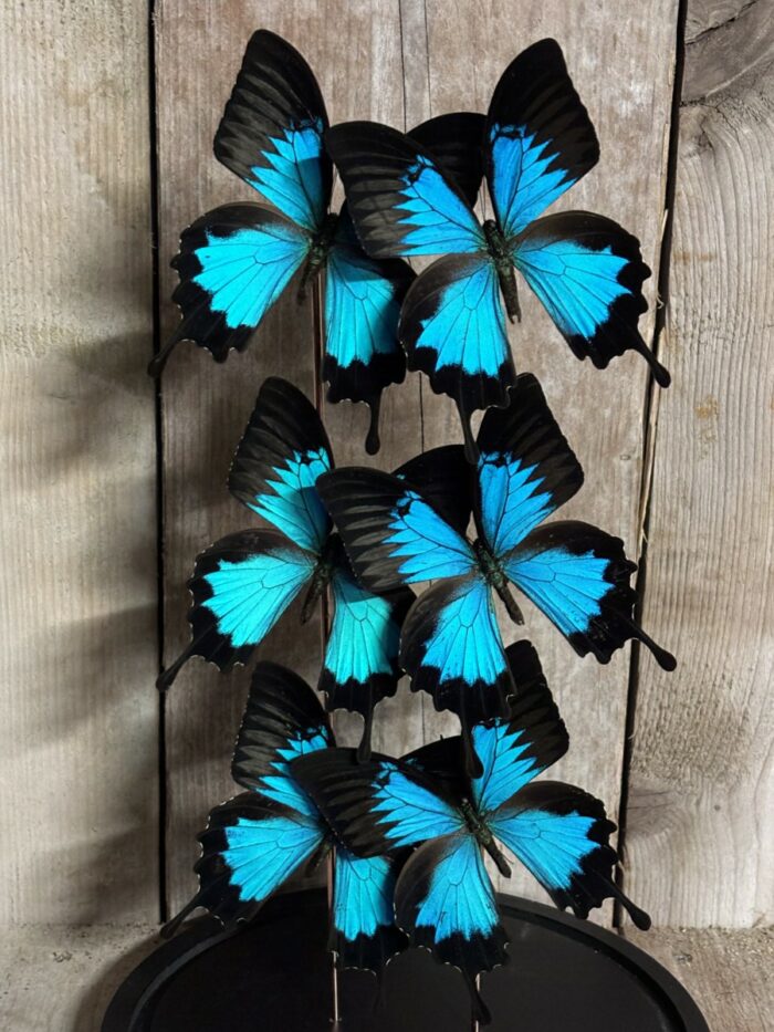 Deze prachtige stolp met maar liefst 6 opgezette vlinders is een elegant kunstobject dat de verfijnde schoonheid van de natuur in huis haalt. De stolp heeft een hoogte van 42 cm en een doorsnede van 22 cm, perfect voor het tentoonstellen van de opgezette vlinders in al hun fragiele pracht. De opgezette vlinders, zorgvuldig geconserveerd en met oog voor detail gepresenteerd, vormen een opvallende blikvanger in iedere ruimte. De glazen stolp biedt optimale bescherming, zodat de opgezette vlinders hun tijdloze schoonheid behouden. Dit decoratieve stuk is niet alleen een indrukwekkend verzamelobject, maar ook een verfijnde manier om de wonderschone details van de opgezette Vlinders te koesteren.