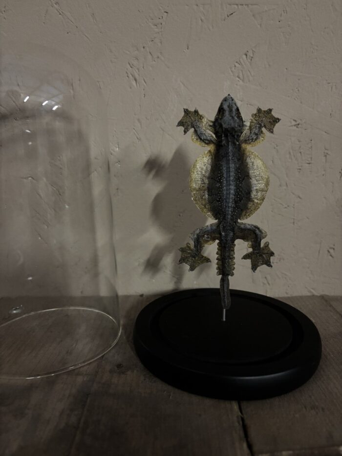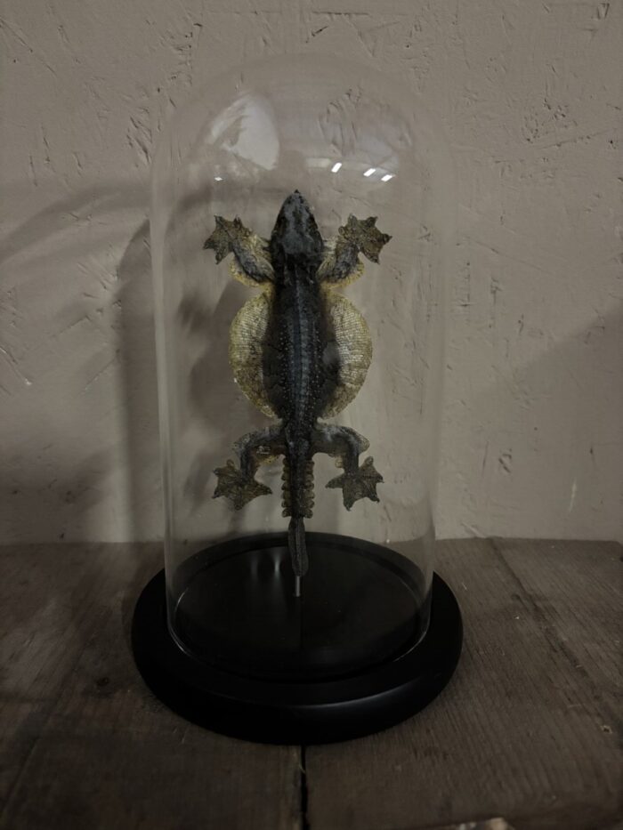 Afmeting van de stolp met vliegende Gekko is 20,5 cm hoog met een doorsnede van 12 cm.