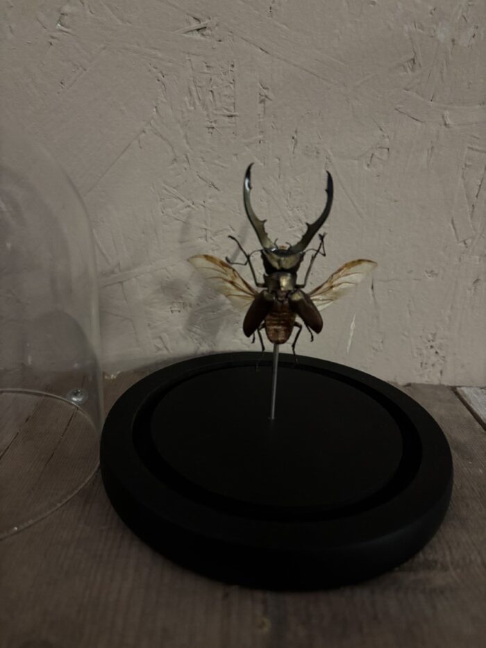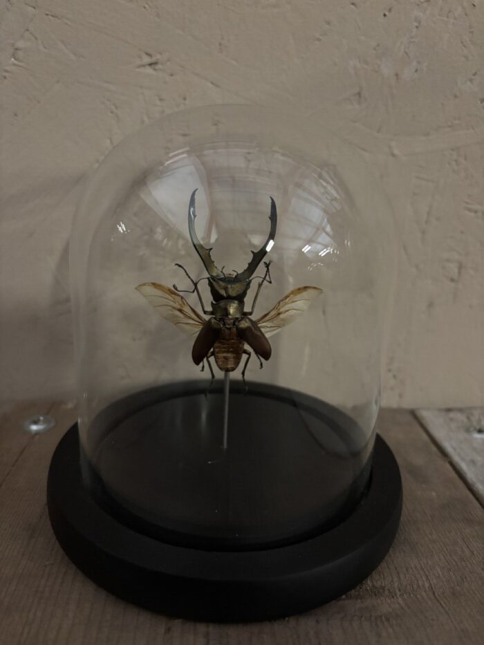 De afmeting van het stolpje met opgezet vliegend Hert is 14 cm hoog met een doorsnede van 12 cm.