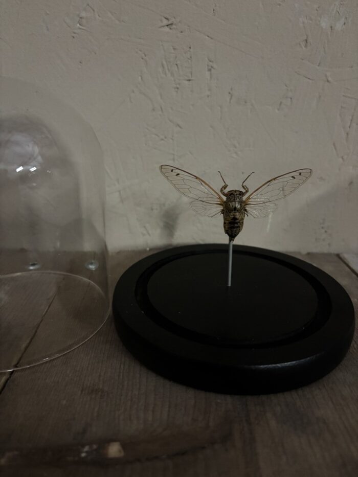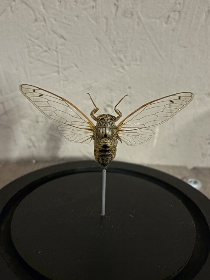 De afmeting van het stolpje met opgezette Cicade Clearwing is 14 cm hoog met een doorsnede van 12 cm.