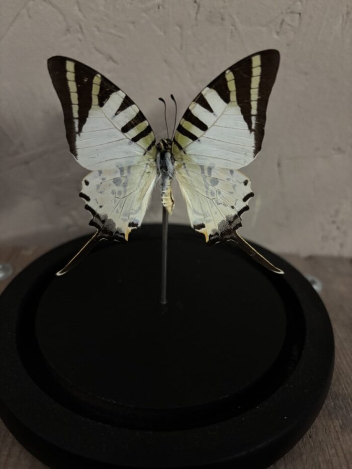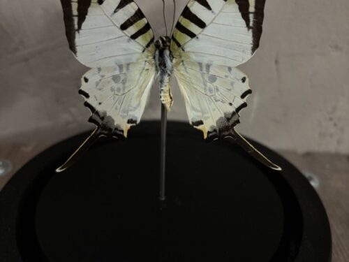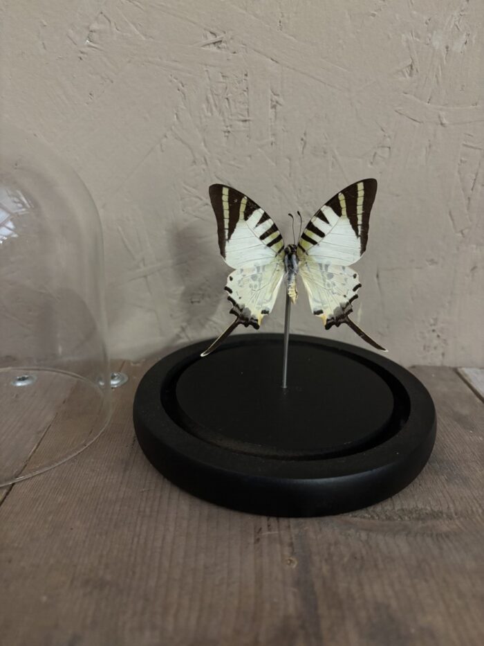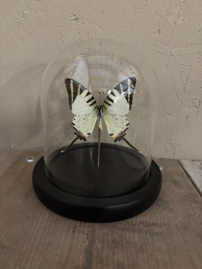 De afmeting van het stolpje met opgezette vlinder is 14 cm hoog met een doorsnede van 12 cm.
