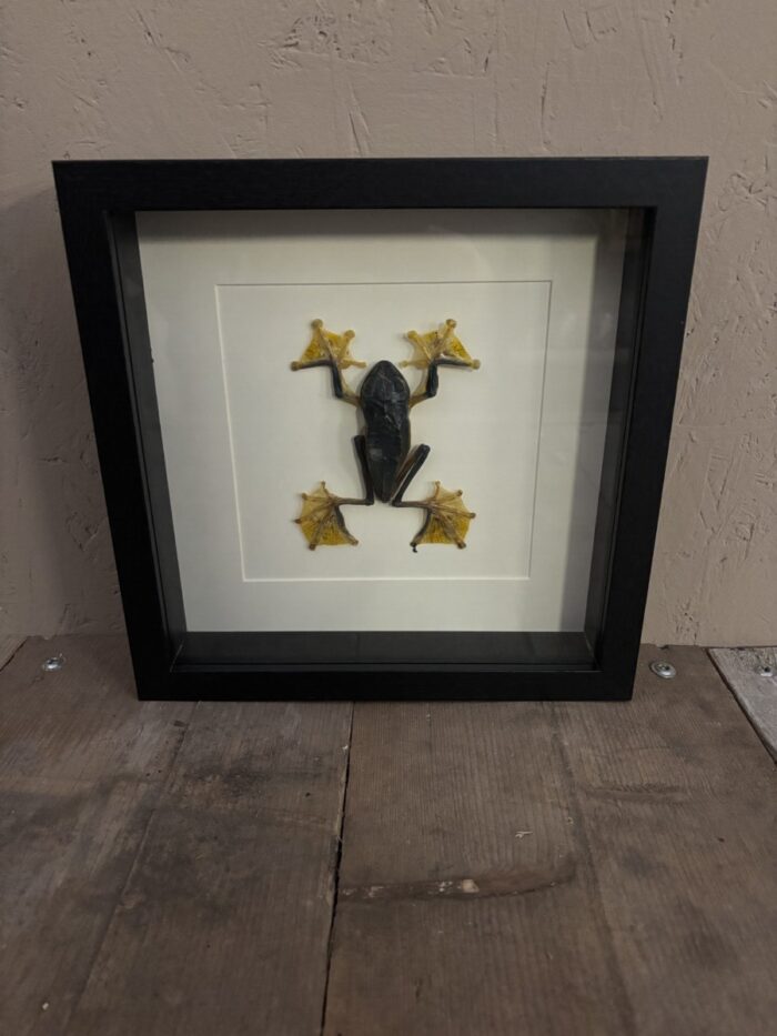 Mooie opgezette vliegende Boomkikker (vrouw) in lijst met witte achtergrond.