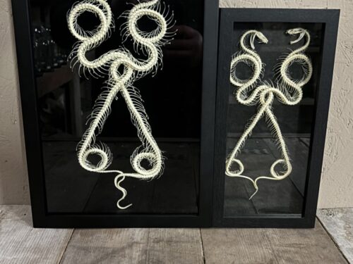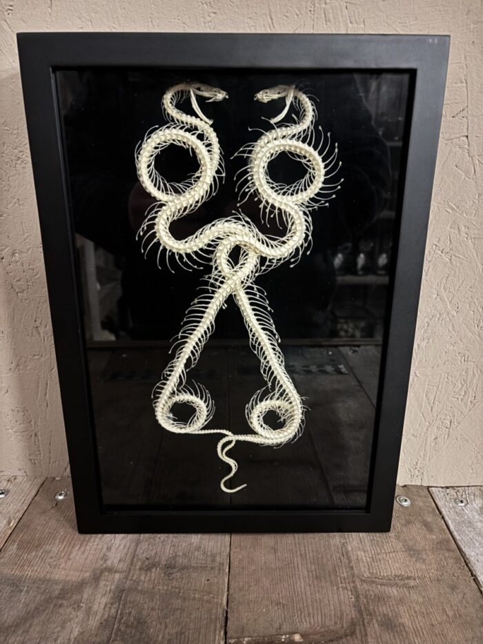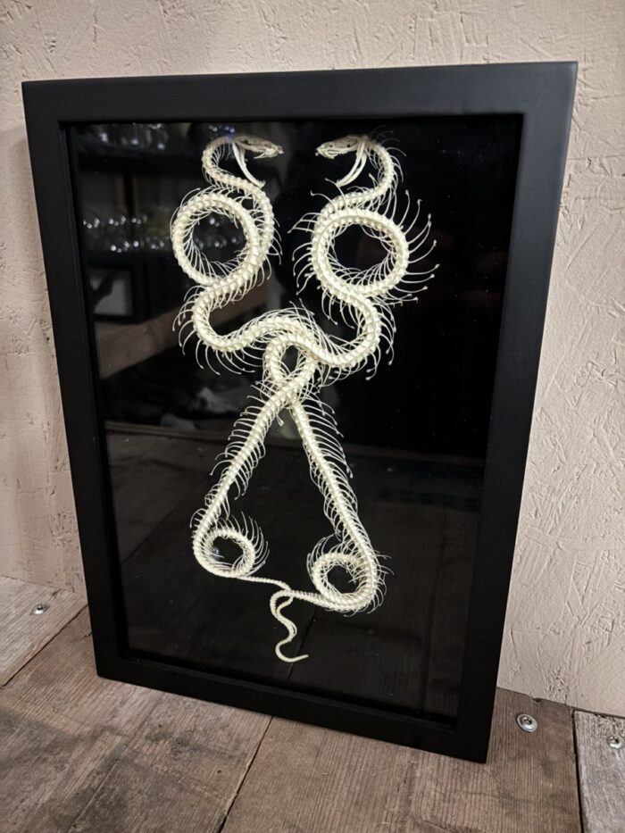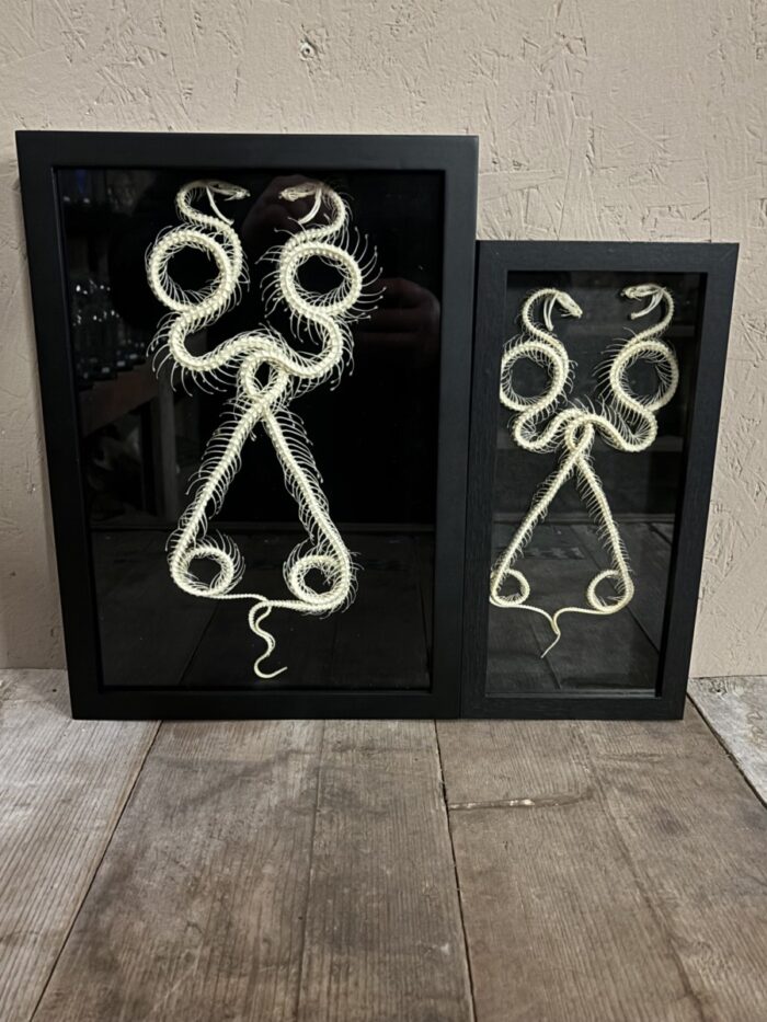 Afmeting van de lijst met twee Slangen skeletten is 39 cm hoog, 27,5cm breed en 6 cm diep.